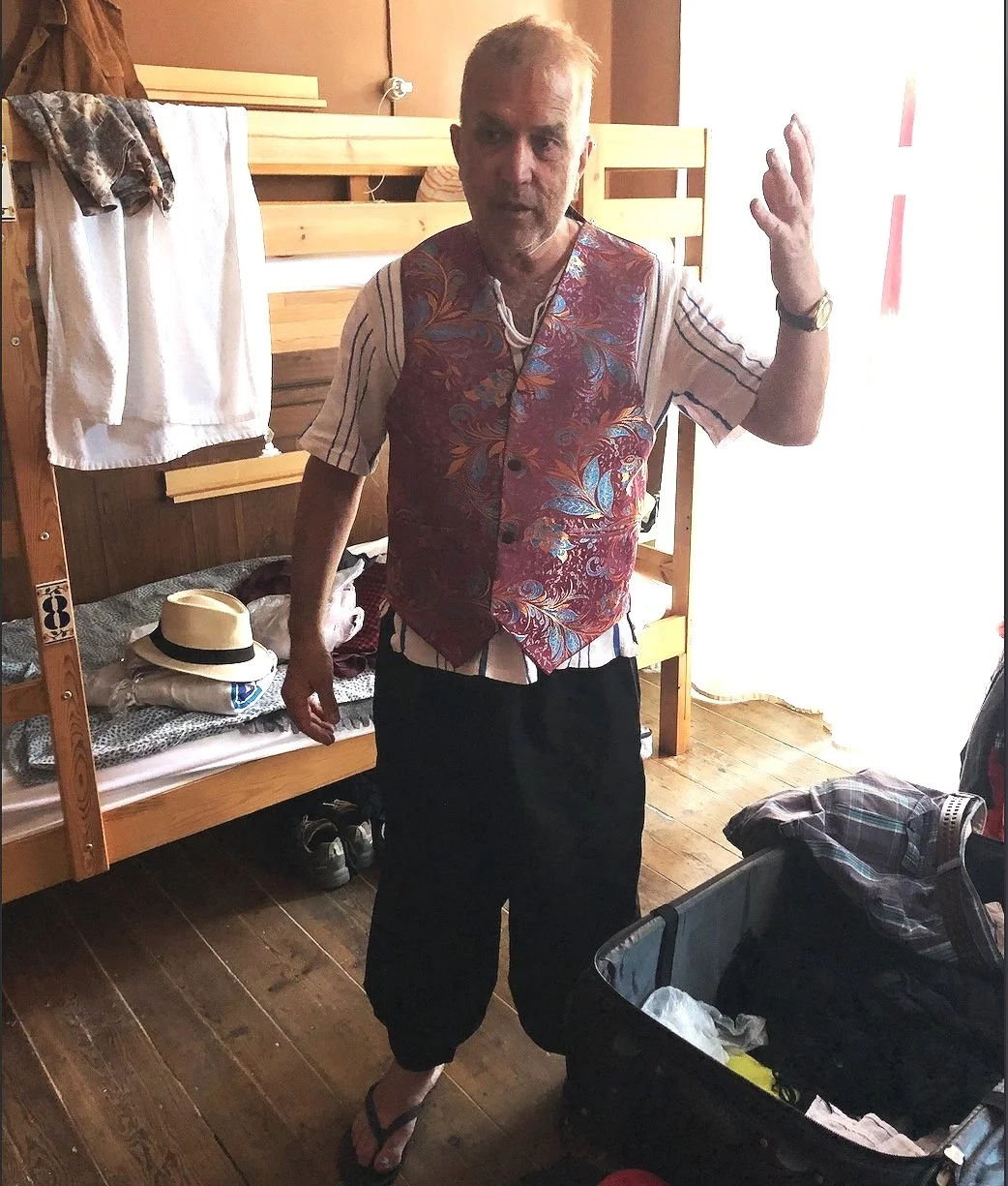 Here is Amir in his Saturday night dancing outfit which he modeled the next day. (He had said that Saturday night was the most well attended and lively session of the whole festival, and indeed he arrived back to the hostel at 6:30 A.M. on Sunday morning.)